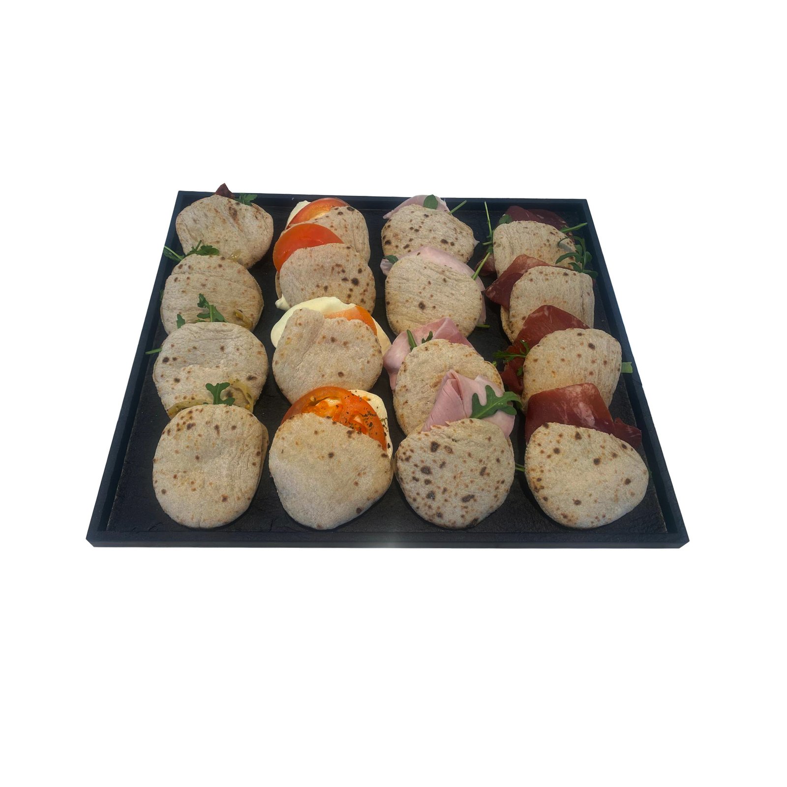 | Füllung: | Truten, Mostbröckli, Käse mit Tartarsauce, Tomate-Mozzarella mit Pesto, Antipasti-Mozzarella, Hummus, frische Peperoni |